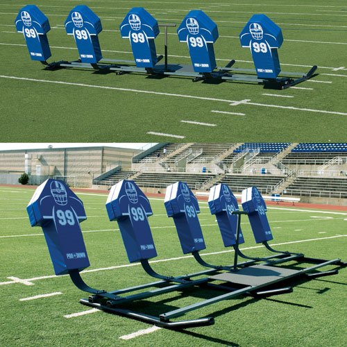 Developed for larger, more physical players and programs. Durable main frame is powder coated steel to prevent rust. Super-Duty flat leaf spring designed to absorb shock and bounce back providing maximum recoil and pressure, just like live action. Tubular steel skids for extreme durability and performance on all field types. Complete with Coach’s platform and lean bar. Royal Blue, 18oz vinyl pads come with a target helmet and number. Built-in “shoulder pads’ provide area for correct hand placement. 52” center to center gap between pads.